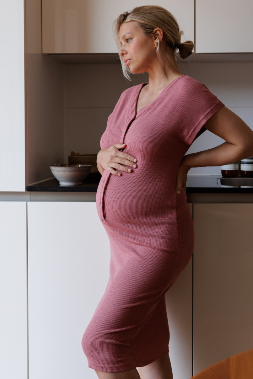 Het perfecte jurkje met drukknoopjes tot je navel in heerlijke stretch stof. Makkelijk te openen om na de geboorte & in je kraamtijd je baby op je buik te leggen voor Huid-op-Huidcontact. Belangrijk voor de hechting baby & mama, positieve effecten op de baby (temperatuur, ontwikkeling hersenen, stabiele hartslag, bloeddruk & borstvoeding).